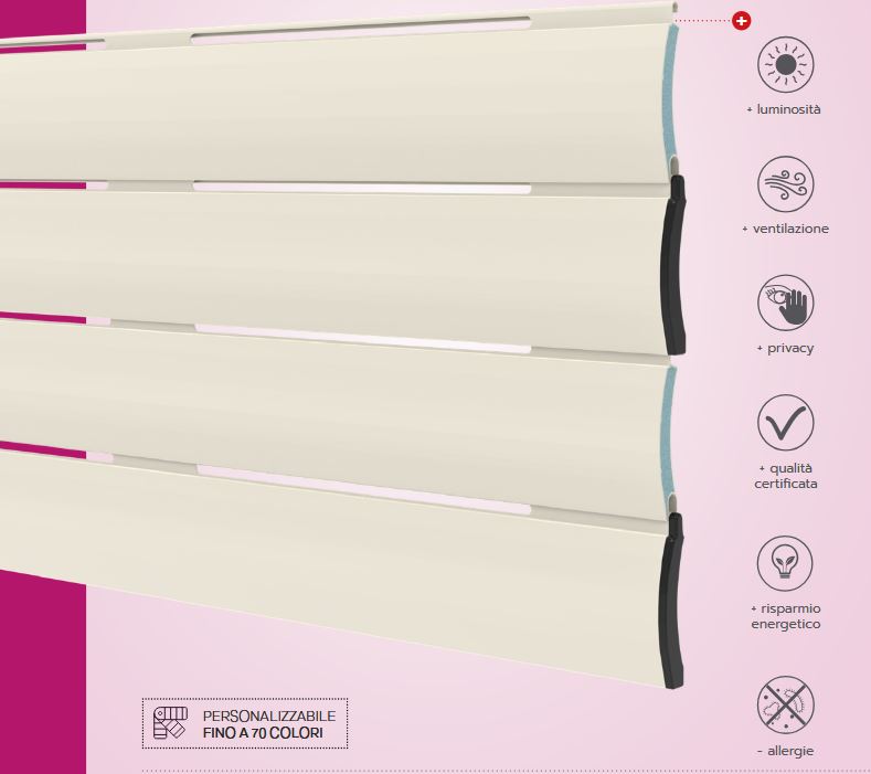 A completare il serramento, una serie di guide con spazzolini laterali che evitano fastidiosi rumori e spifferi. Tutto questo senza trascurarne il design: si ha possibilità di scelta tra una vasta gamma di colori e finiture seguendo i colori obbligatori se si installa in condomini, oppure con colori a scelta e modelli che si adattano all’arredamento della casa, non trascurando il necessario risparmio energetico.